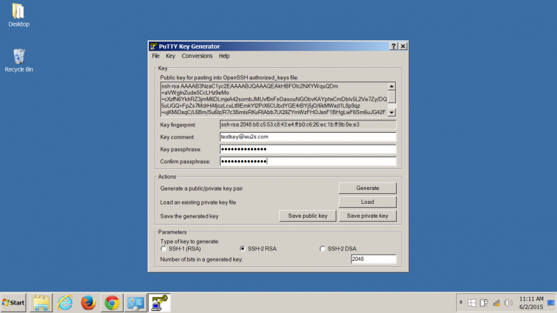 6. Give the key pair a suitable comment so that you will remember what the keys are used for. Here we just entered testkey@wu2s.com for an example. Whatever you enter in the "Key Comment" field must look like an email address - no spaces and the "@" is present as in callsign@example.com Also enter a suitable passphrase to use when accessing the private key. |