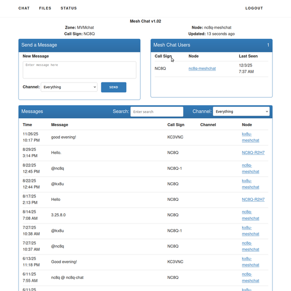 Orv W6BII've been interested in other chat programs, and might implement others at some time. However the real attraction of MeshChat for me is that it can be hosted on the node itself, and does not require a server/client relationship on a Pi or an X86 machine. This allows us to have the message database be redundantly protected. We assume parts of our network will go down in a disaster so we want a resilient app and MeshChat does that easily.