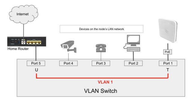 In this example if you set your SXTsq node to "5 host" Network mode (rather than NAT), then connect the node's Ethernet port to a smart switch that can provide VLANs. Set port 1 to VLAN 1 tagged and set port 5 to VLAN 1 untagged. All of the other switch ports become available for you to plug in computers or cameras or phones that will get their IP addresses on your node's LAN network. You node will get a WAN IP address automatically via DHCP from your home router.