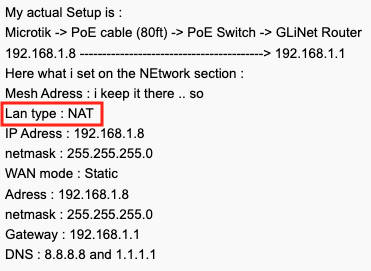 Microtik -> PoE cable (80ft) -> PoE Switch -> GLiNet Router